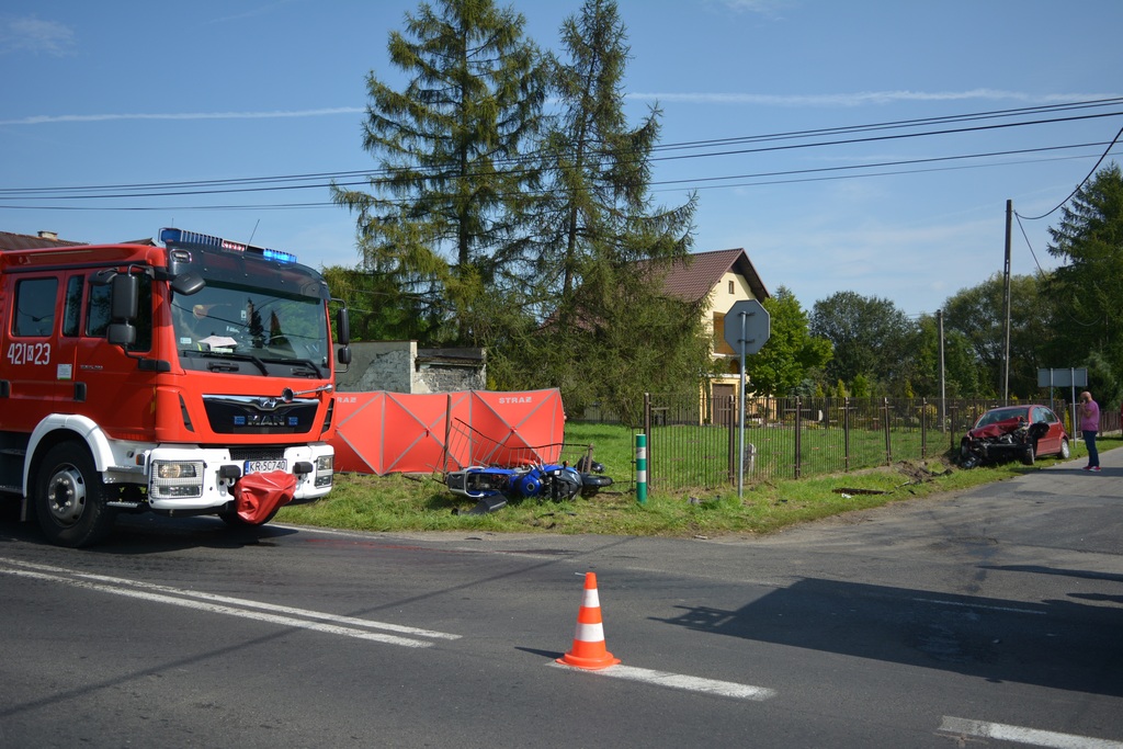 10.09.2017 o godz. 10.20 dyżurny SKKP w Chrzanowie otrzymuje zgłoszenie zderzenia samochodu osobowego z motocyklistą na DW 781 w Babicach na skrzyżowaniu ul. Zakopiańskiej i Piastowskiej. Ze zgłoszenia wynikało również, że na miejscu prowadzona jest już reanimacja poszkodowanego motocyklisty. Na miejce zadysponowane zostały SiŚ PSP w Chrzanowie oraz OSP (KP PSP, JRG Chrzanów, OSP Rozkochów i OSP Babice) jak również Policję oraz Zespoły Państwowego Ratownictwa Medycznego, w tym śmigłowiec LPR. Mimo niemal natychmiast podjętej reanimacji z użyciem defibrylatora AED, po blisko godzinnej reanimacji nie udało się uratować 36 letniego motocyklisty - lekarz stwierdził zgon. Ze wstępnych ustaleń wynika, że kierująca Citroenem nie ustąpiła pierwszeństwa przejazdu nadjeżdżającemu ul. Zakopiańską od strony Biedronki motocykliście. Utrudnienia w ruchu na DW 781 trwały ponad 4 godziny.